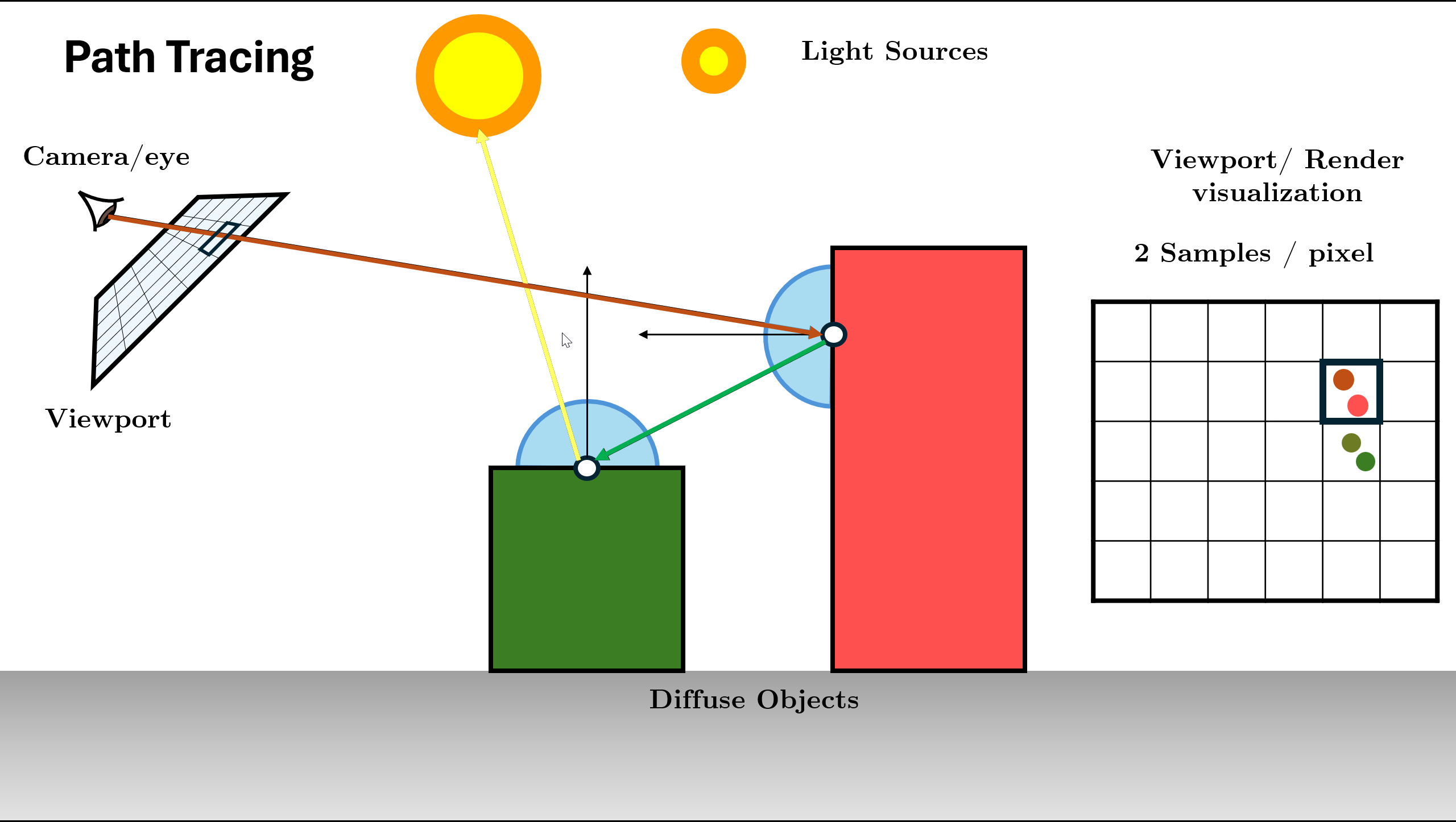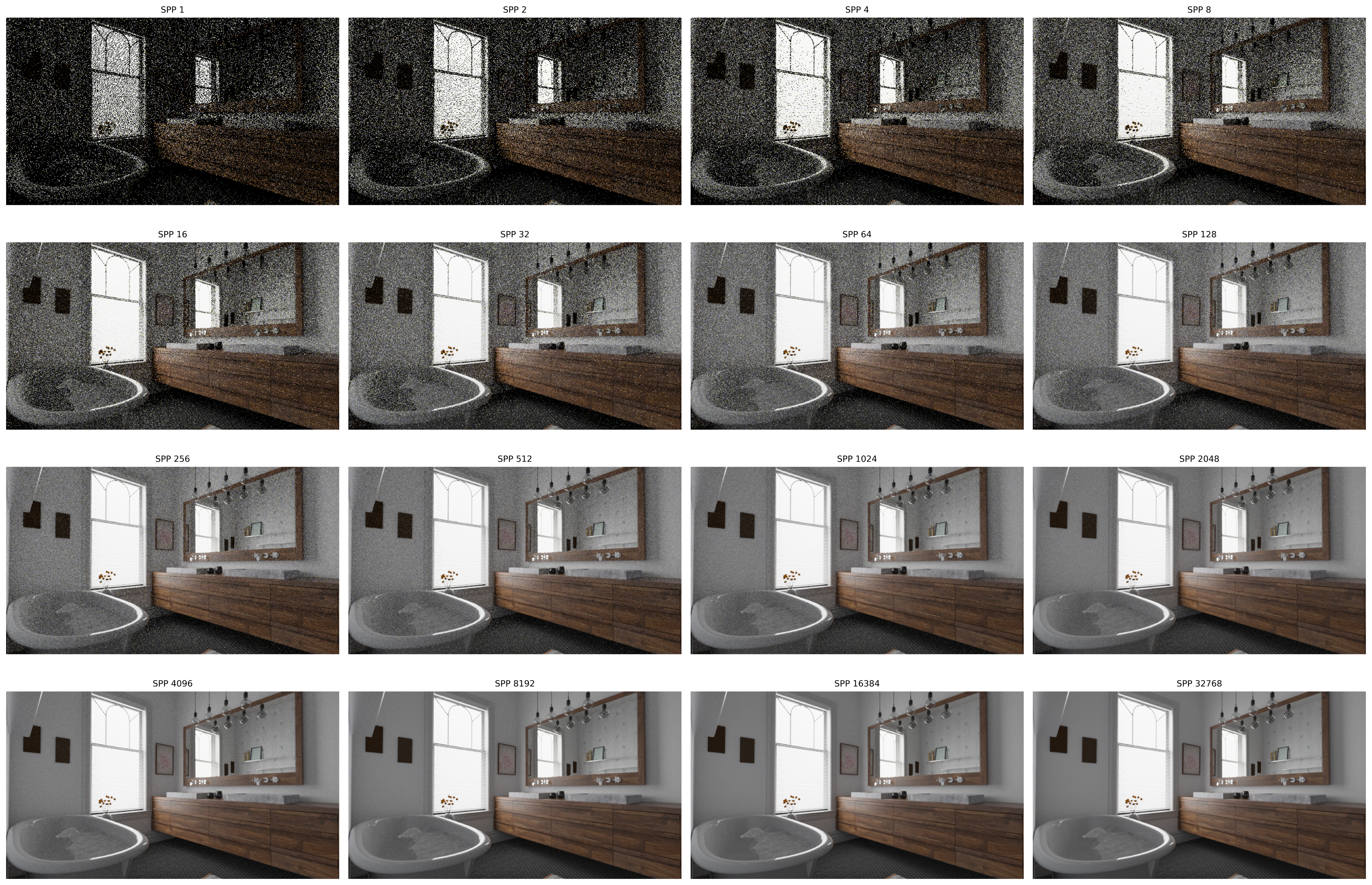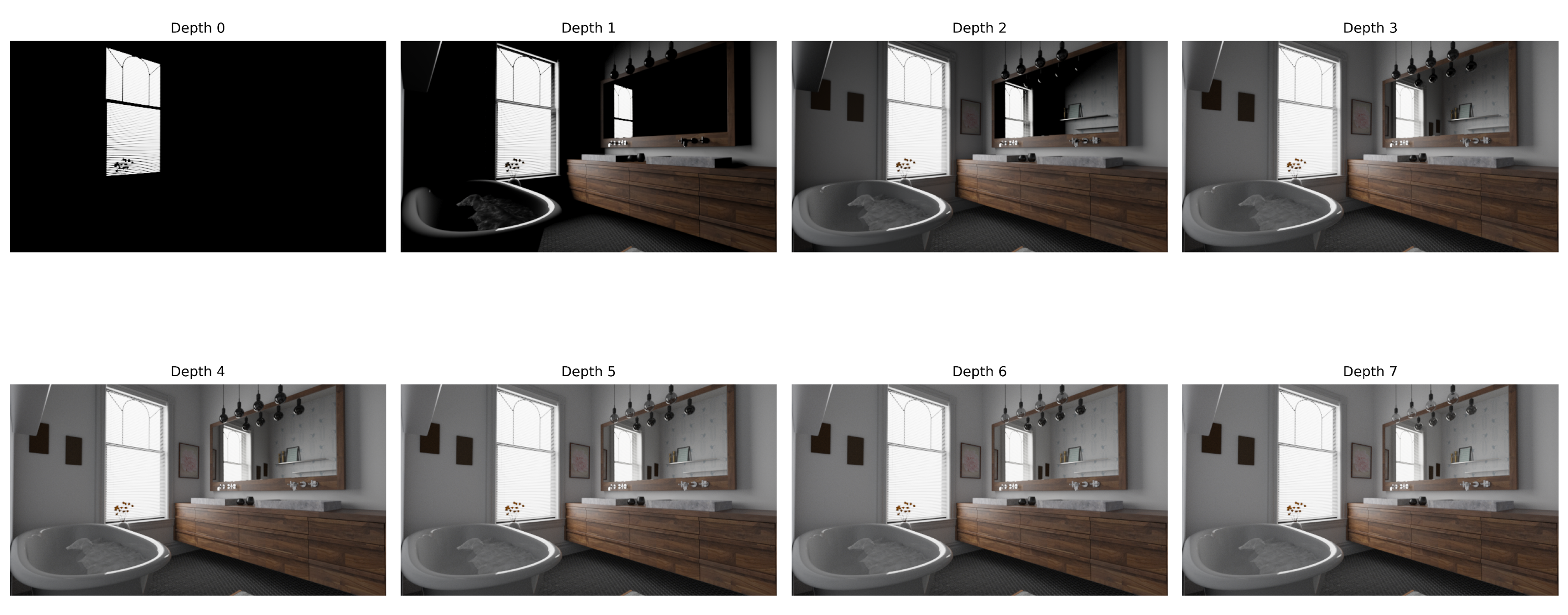 $$ \begin{aligned} L(x\to v) &= E_x \\ &\quad + \int_{\Omega} f_r\,E_{x'}\cos(\theta_{\omega})\,d\omega \\ &\quad + \int_{\Omega} f_r \int_{\Omega'} f_r'\,E_{x''}\cos(\theta_{\omega'})\cos(\theta_{\omega})\,d\omega'\,d\omega \\ &\quad + \int_{\Omega} f_r \int_{\Omega'} f_r' \int_{\Omega''} f_r''\,E_{x'''}\cos(\theta_{\omega''})\cos(\theta_{\omega'})\cos(\theta_{\omega})\,d\omega''\,d\omega'\,d\omega \\ &\quad + \cdots \end{aligned} $$After expanding the rendering integra, we can easily visualize the components of the integral and how they contribute to the final image