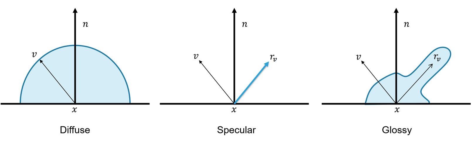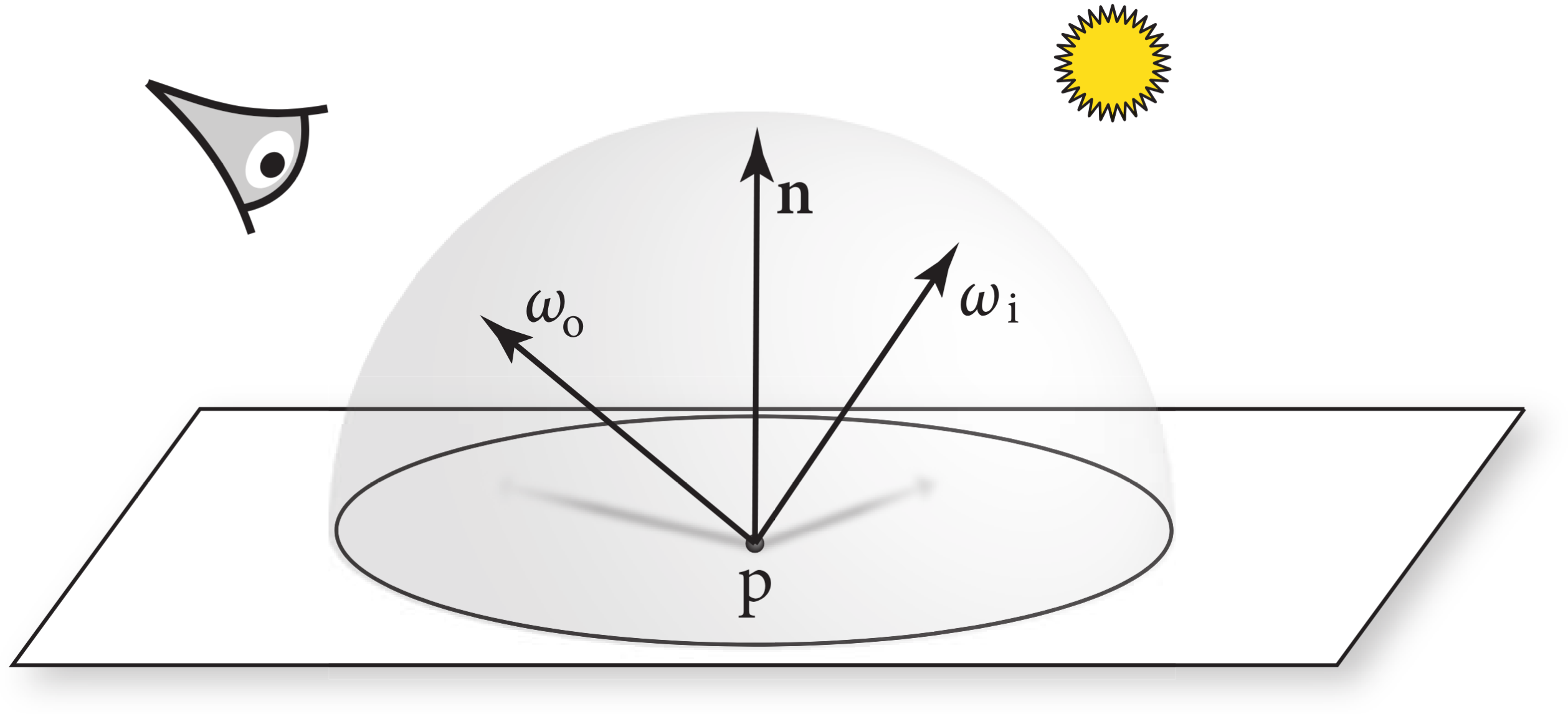 - $f_r(x, \omega_i, \omega_o)$ - BRDF (Bidirectional Reflectance Distribution Function): fraction of light from direction $\omega_i$ scattered into $\omega_o$.