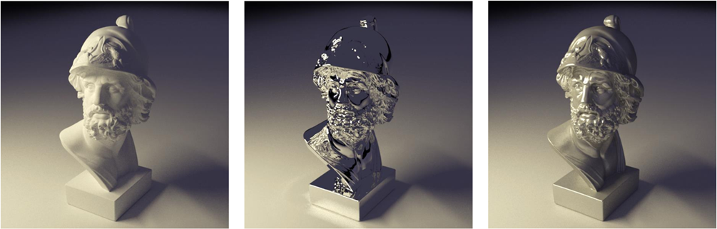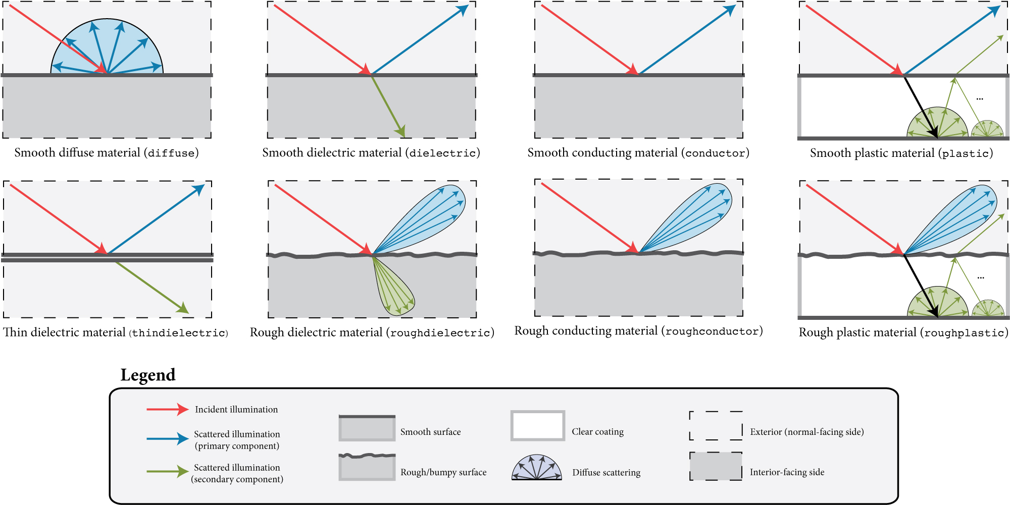 - Light scattering at surfaces: Each object must provide a description of its appearance, including information about how light interacts with the object’s surface, as well as the nature of the reradiated (or scattered) light. Models for surface scattering are typically parameterized so that they can simulate a variety of appearances.
