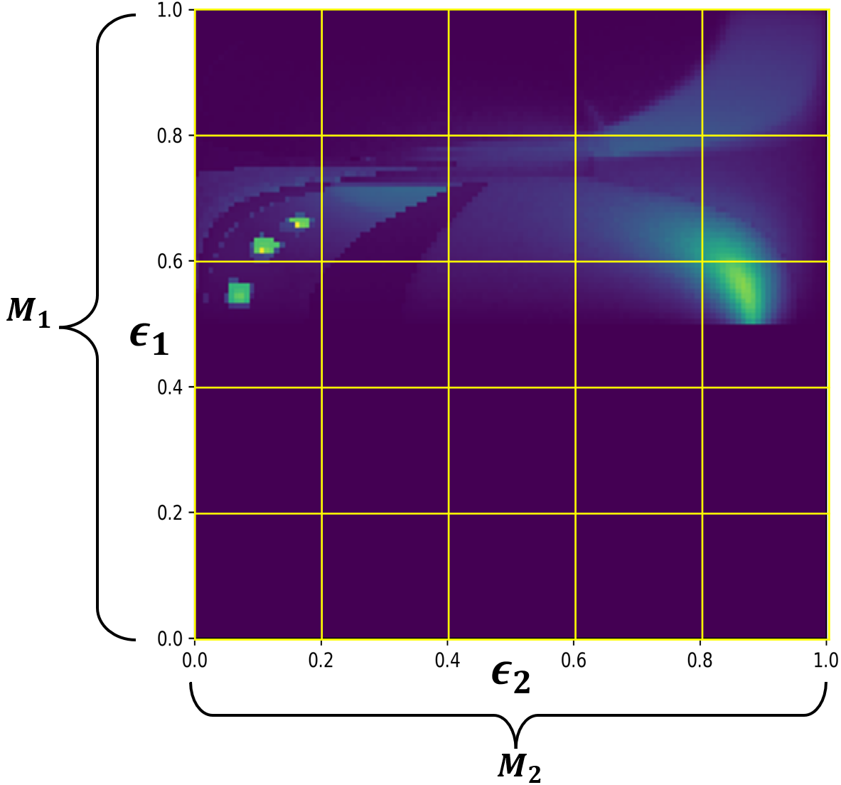 We discretize the two domains $\epsilon_1$ and $\epsilon_2$ into $M_1$ and $M_2$ discrete locations, respectively, and use two independent networks to estimate the PDF at those locations.