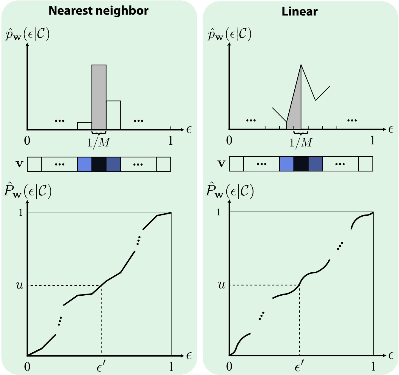 $$ p_{\boldsymbol{\omega}}(\epsilon \mid \mathbf{C}) = (1-\alpha)\mathbf{v}[m] + \alpha\mathbf{v}[m+1] $$where $m = \lfloor \epsilon M - 0.5 \rfloor$ and $\alpha = \epsilon M - m - 0.5$.