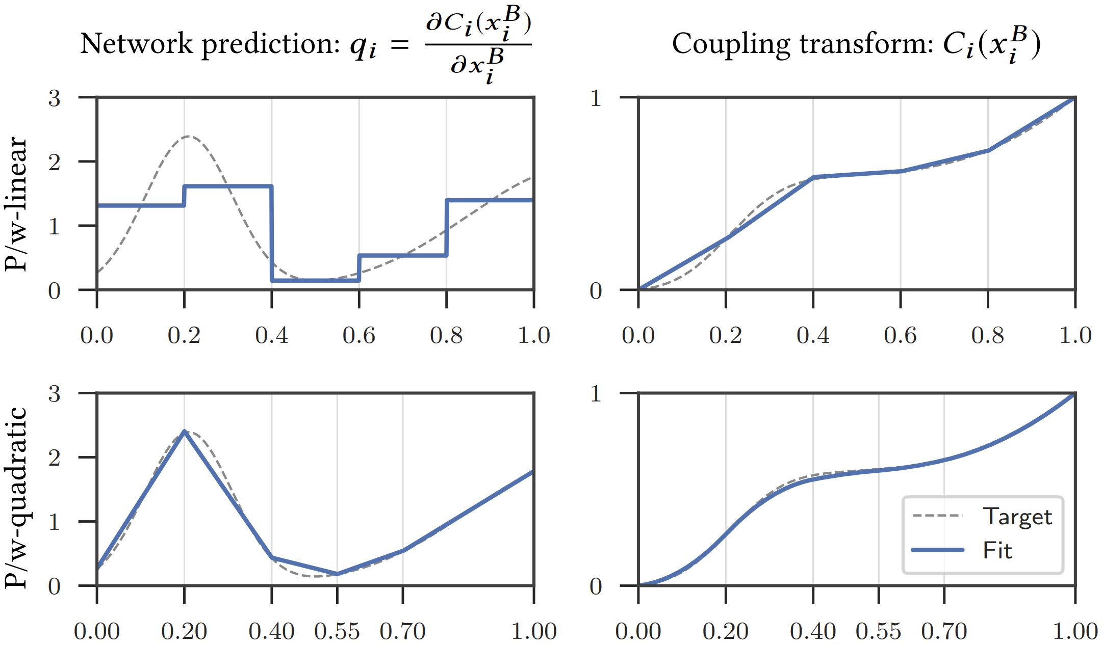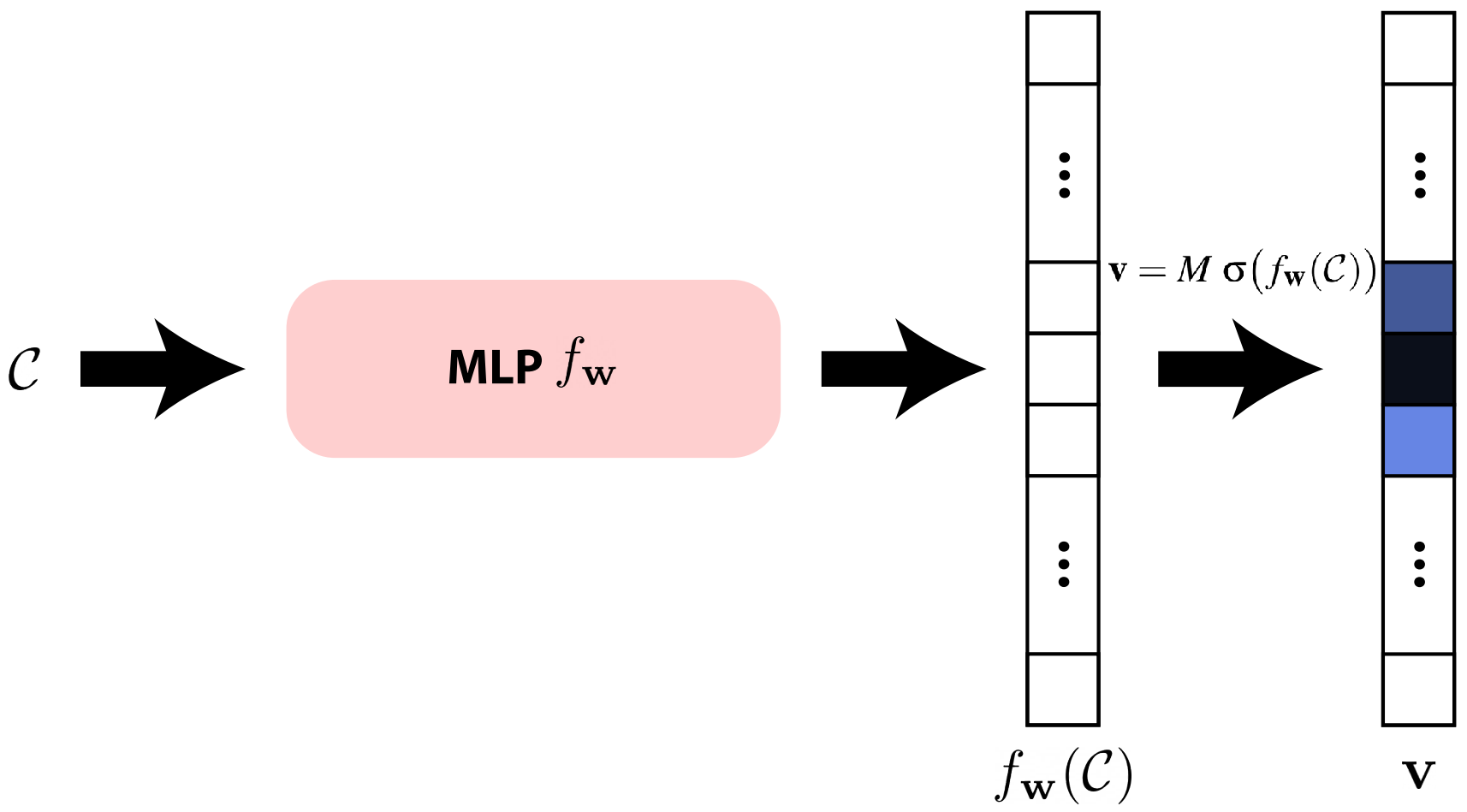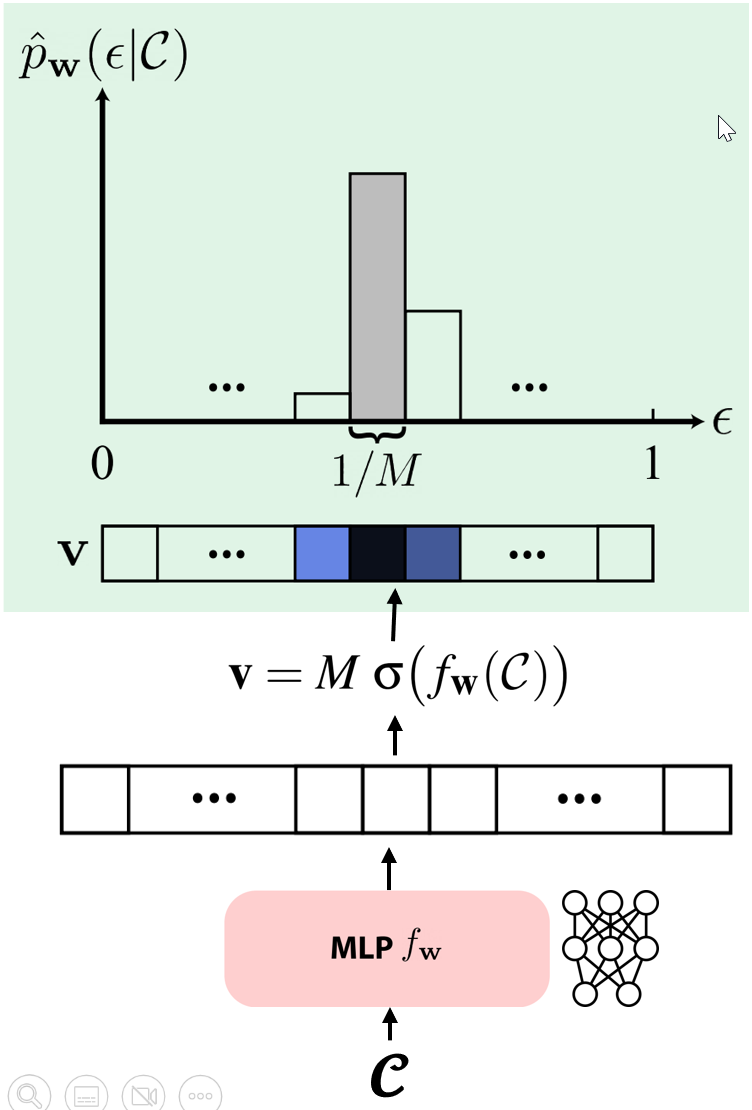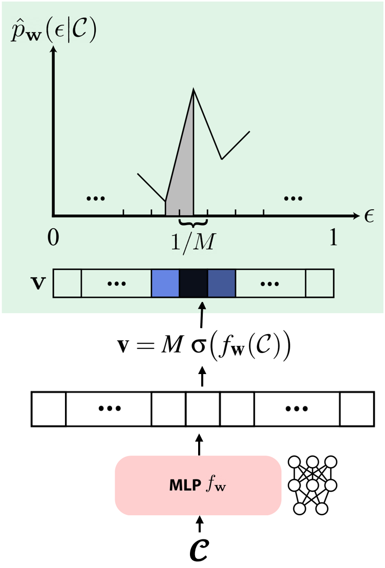 $$ \mathbf{v} = M \cdot \text{softmax}(f_{\boldsymbol{\omega}}(\mathbf{C})) $$where $\mathbf{C}$ is the condition (different for marginal and conditional) and $M$ is the number of bins.