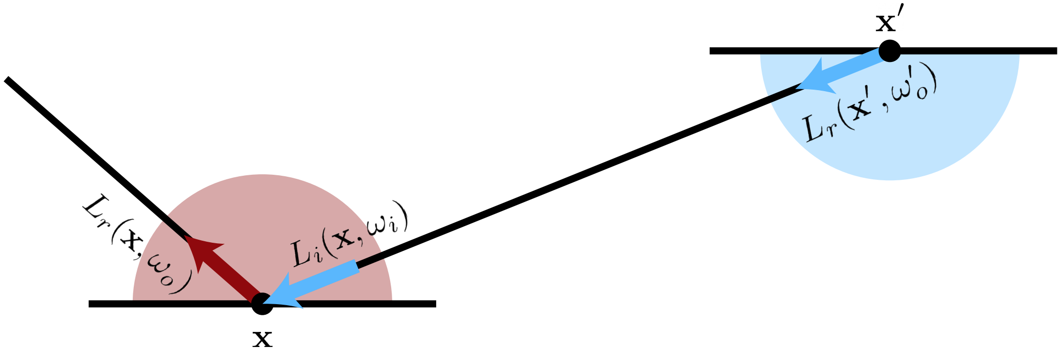 - $L_o(y, -\omega_i)$ - outgoing radiance from $y$ toward $x$.