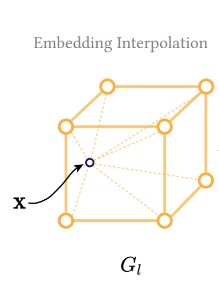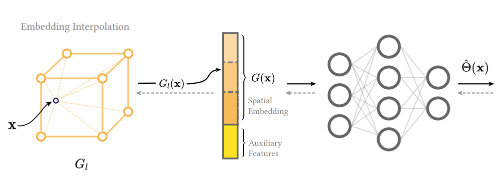- Position $\mathbf{x}$: Learnable dense grid encoding