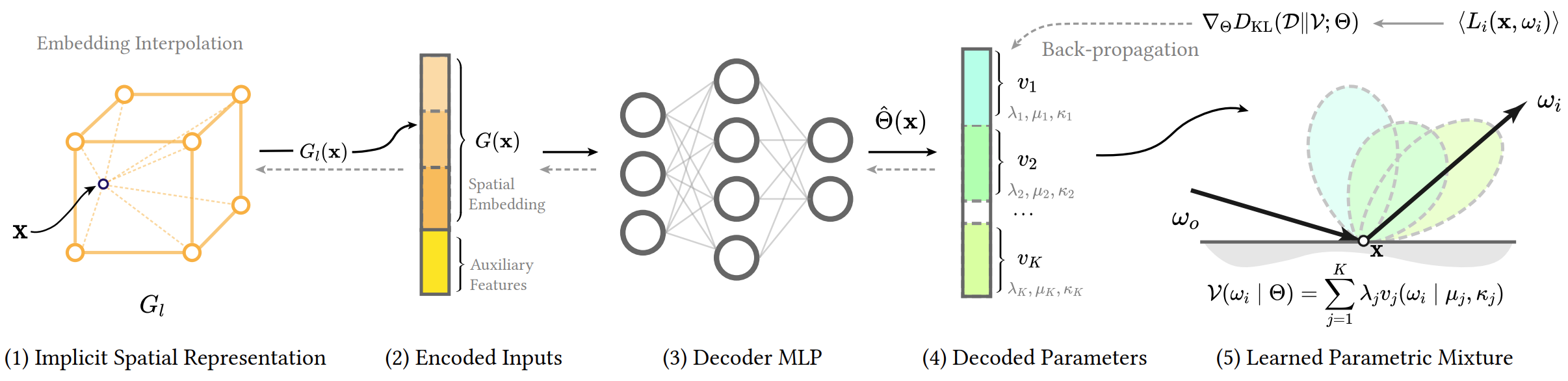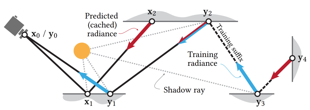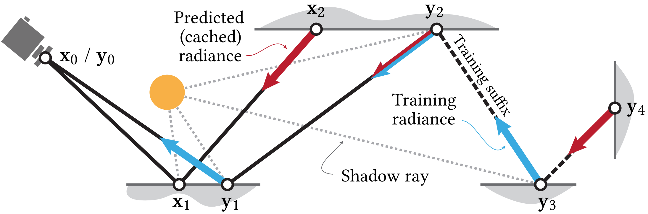 $$ \hat{p}^*(\boldsymbol{\omega}_i \mid \mathbf{x}, \boldsymbol{\omega}_o) = \frac{f_s(\mathbf{x}, \boldsymbol{\omega}_o, \boldsymbol{\omega}_i) \cdot f_{\boldsymbol{\Phi}}(\mathbf{x}', \boldsymbol{\omega}_o') \cdot \cos\theta_i}{f_{\boldsymbol{\Phi}}(\mathbf{x}, \boldsymbol{\omega}_o)} $$The radiance caching approach follows Neural Radiance Caching (NRC) and uses a small MLP network that takes surface location and ray direction as input and estimates the corresponding radiance.