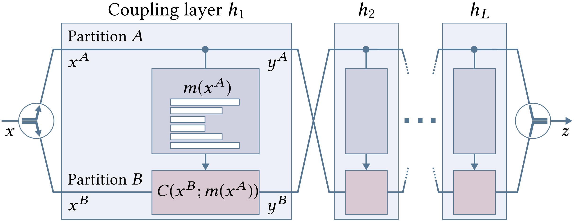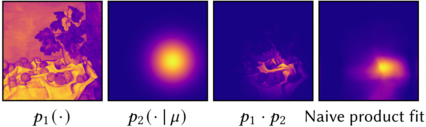 $$ p(\epsilon_1, \epsilon_2 \mid \mathbf{x}, \boldsymbol{\omega}_o) = p_{\boldsymbol{\omega}_1}(\epsilon_1 \mid \mathbf{x}, \boldsymbol{\omega}_o) \cdot p_{\boldsymbol{\omega}_2}(\epsilon_2 \mid \epsilon_1, \mathbf{x}, \boldsymbol{\omega}_o) $$Through this representation, estimating the joint PDF boils down to predicting two 1D distributions.