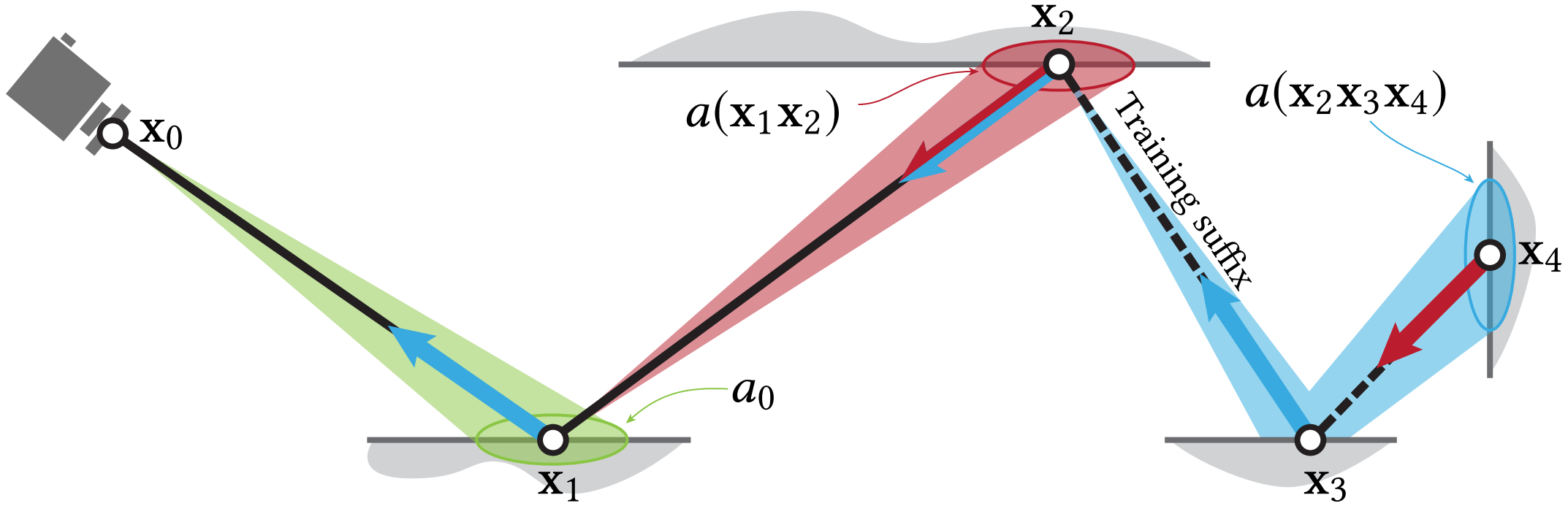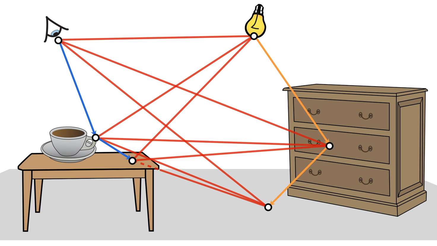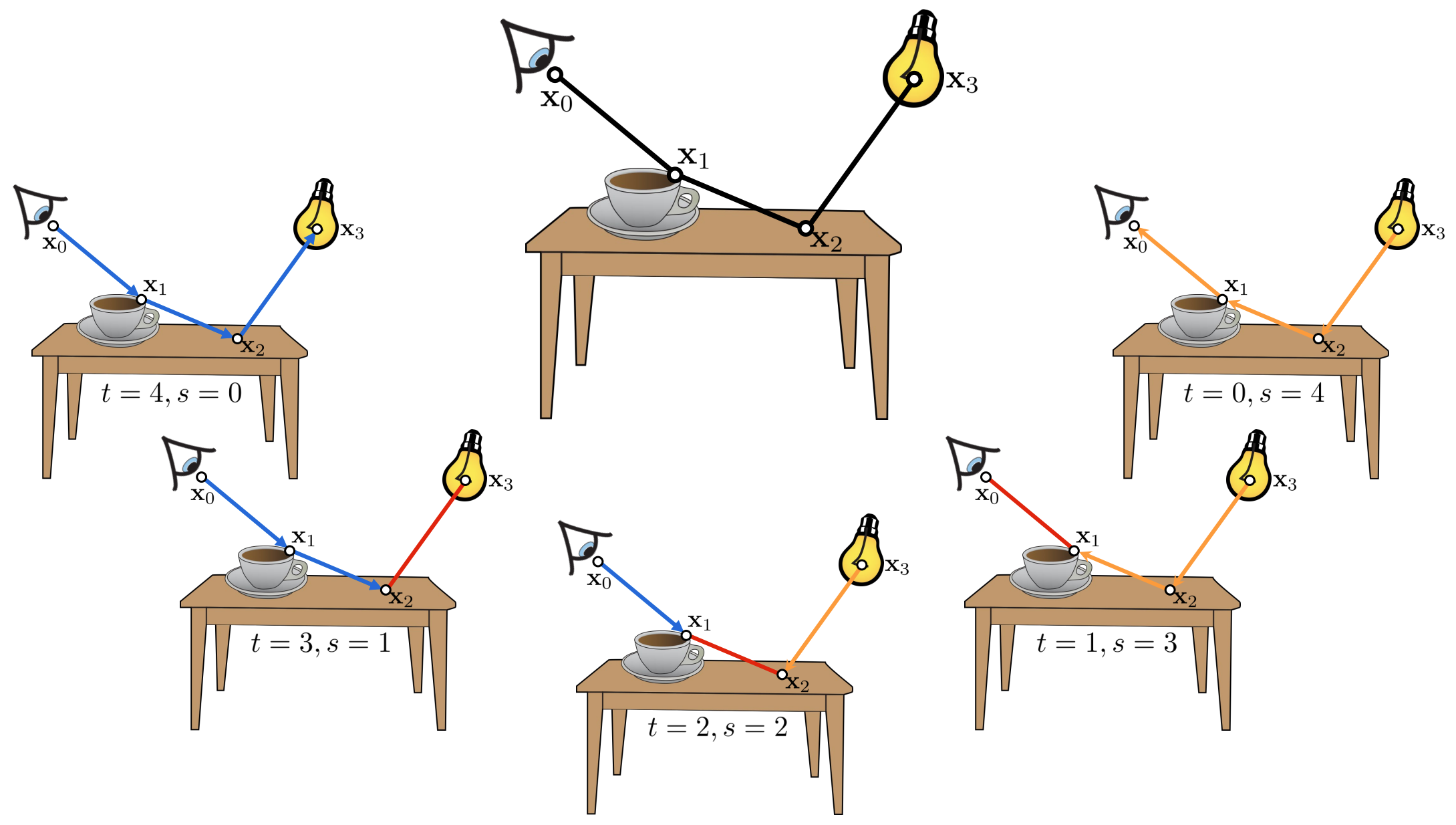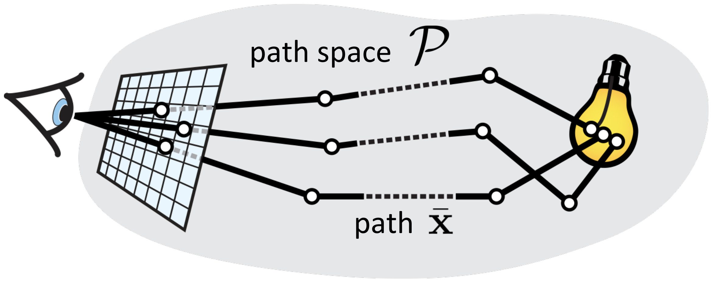 - $\mathcal{P}$ - set of all possible light paths of all lengths $$ \bar{x} = (x_0, x_1, \ldots, x_k) \in \mathcal{P_k} $$ $$ \mathcal{P} = \bigcup_{k=1}^{\infty} \mathcal{P_k} $$ with vertices on surfaces or in volumes.
