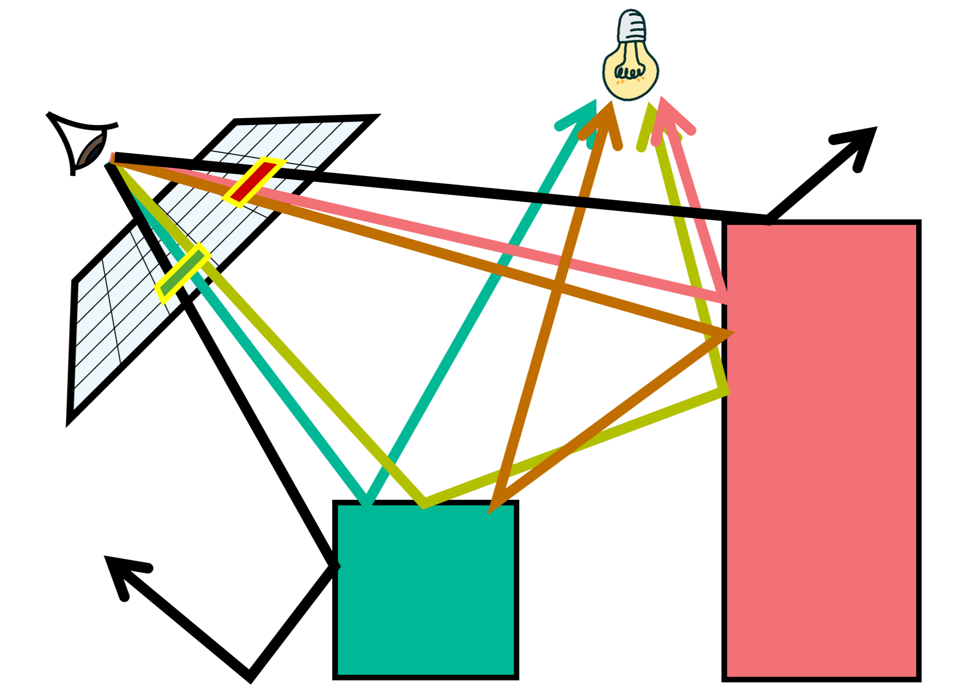 Indirect light transport: Because light can arrive at a surface after bouncing off or passing through other surfaces, it is usually necessary to trace additional rays to capture this effect.