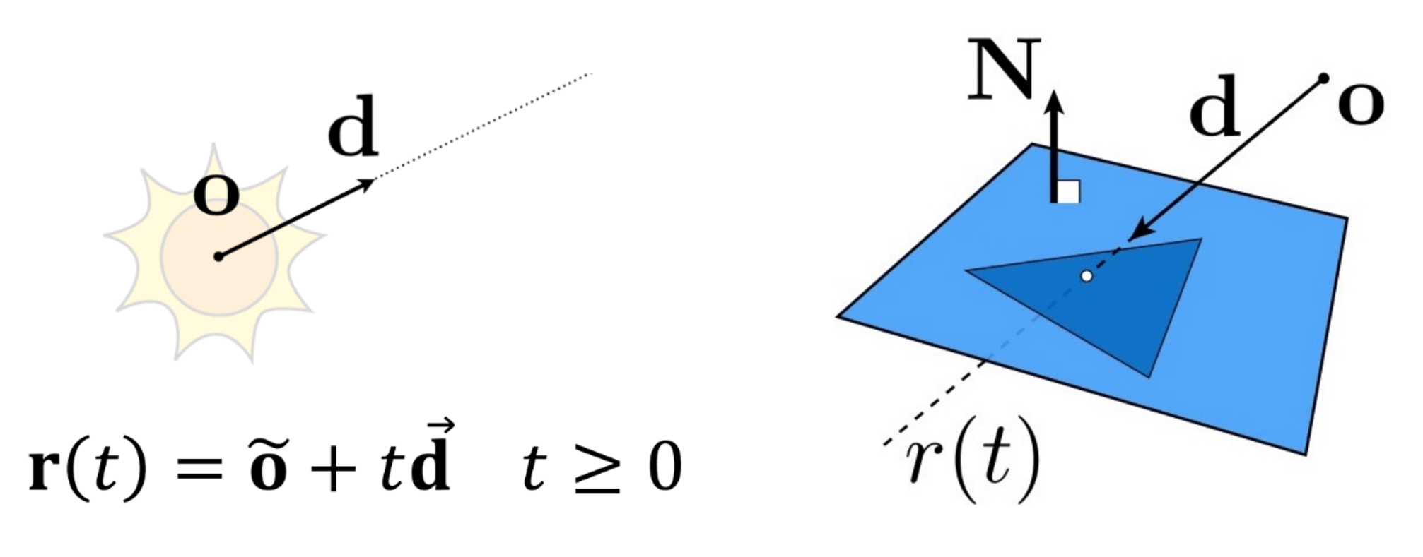 - Ray-object inetrsections: We must be able to tell precisely where a given ray intersects a given geometric object. In addition, we need to determine certain properties of the object at the intersection point, such as a surface normal or its material.